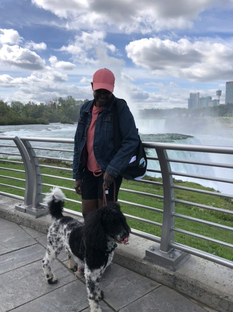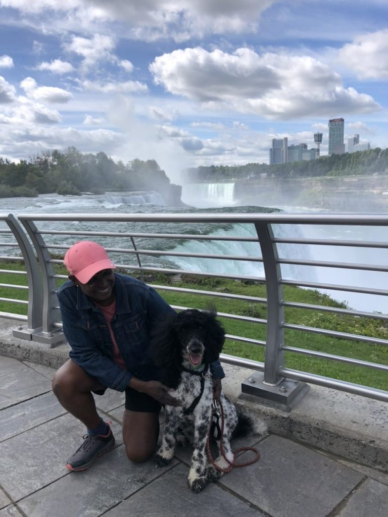 Gracie made a big splash at the Falls. People wanted pictures with her, and there were many compliments on what a pretty dog she is. Gracie, of course, happily soaked up the attention.