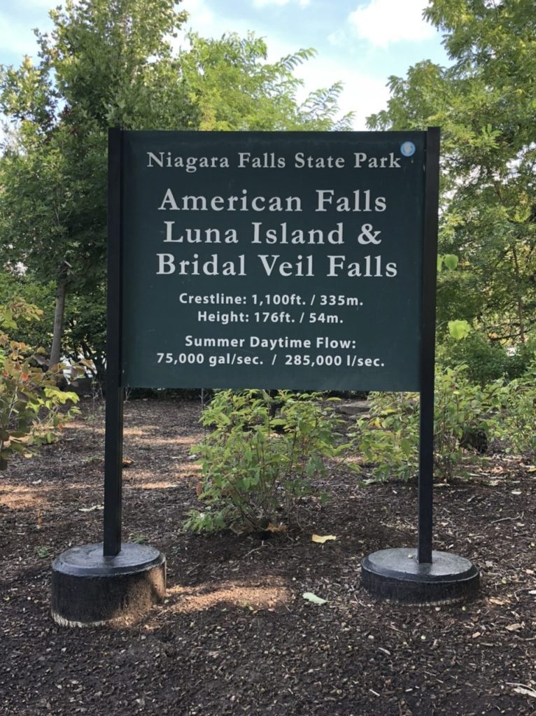 The photo above shows the American Falls in the foreground. Luna Island is next, and on the other side of Luna is the Bridal Veil, not visible in the photo. The furthest section of the falls is Horseshoe Falls. The buildings on the far bank of the gorge below the falls are in Canada.