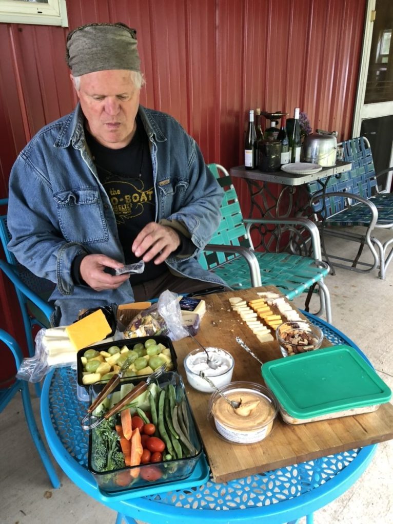 Back at the ranch, we enjoyed a nosh of garden veggies, cheeses and spreads, along with cocktails and wine 😋, and Andy hung a sign over the front door to the building ☺️ – now that says it all!