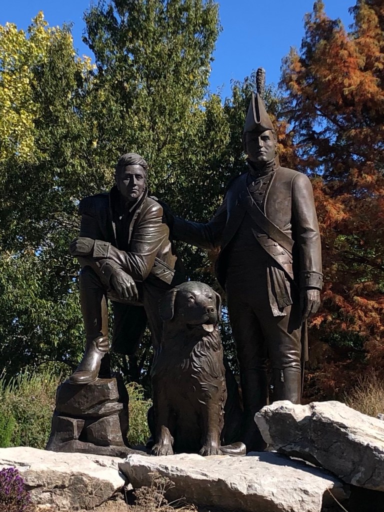 A bronze sculpture of William Clark, Meriwether Lewis, and Lewis’s Newfoundland, Seaman, in the riverfront park that houses the museum in St Charles