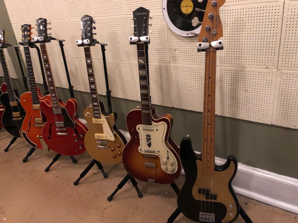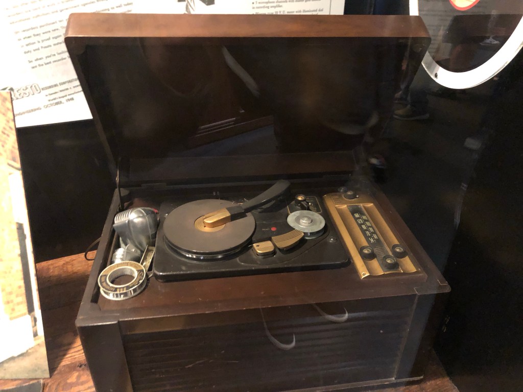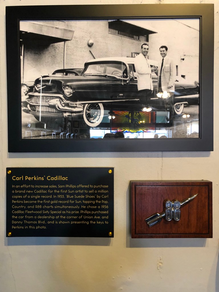 The front entrance to Sun Studio.Dewey Phillips broadcasting studio was located in a Memphis hotel. When the hotel was remodeled, his studio was removed and relocated to the museum at Sun Studio. A wire recorder from the 1940’sThe origins of blues musicMarion Keisker’s officeGuitars used by some of Sun’s studio musicians and headlinersHammond B3Elvis was not the only major talent to record for Sun. Many other famous blues and rock musicians recorded here, including Johnny Cash, BB King, Carl Perkins, Jerry Lee Lewis, Ike Turner, and so many others. Here our tour guide talks about a famous photo of Elvis, Johnny Cash, Jerry Lee Lewis and Carl Perkins recording at the studio. This spur-of-the-moment jam session became known as the Million Dollar Quartet. A hit Broadway musical is based on it as well. Carl Perkins was the first to record a gold record for Sun, with his recording of “Blue Suede Shoes.” Sam bought him a Cadillac as a reward.