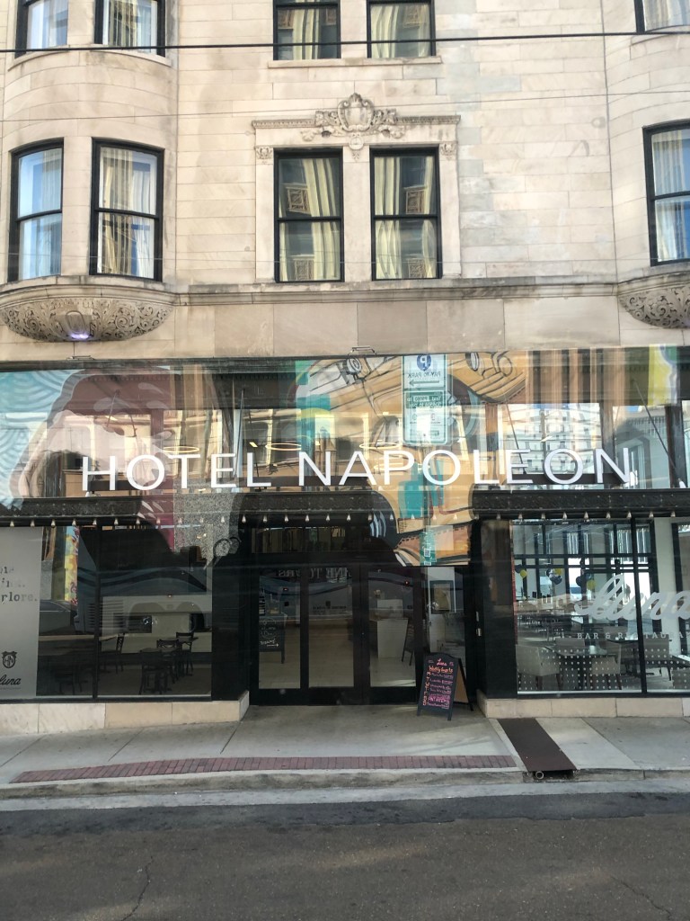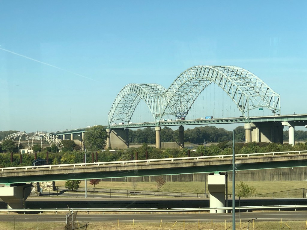 Murals decorate the exterior of several building in Memphis The boutique Hotel Napoleon occupies the former home of the Memphis Press-Scimitar, built by Napoleon Hill, owner of the newspaper and Memphis’s wealthiest citizen, in 1902.BB King Blvd honors one of Memphis’s most famous sons. Victorian-era mansionAnotherSmaller house on the grounds of one mansion, built for the owner’s daughter Bass ProShop, seen from I-40. The building was originally used for Memphis Grizzlies games but was sold to Bass ProShops when a new arena was built. The building houses a luxury hotel, retail space, and an elevator to an observation deck and restaurant near the top of the pyramid. The bar at the topDes standing on the observation deck. The floor is glass. I avoided walking on it. The I-40 bridge over the Mississippi River between Memphis, Tennessee and West Memphis, Arkansas. The locals refer to it as the Dolly Parton bridge.