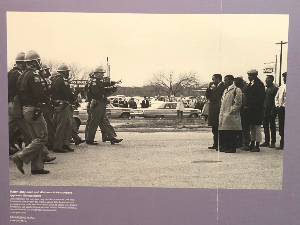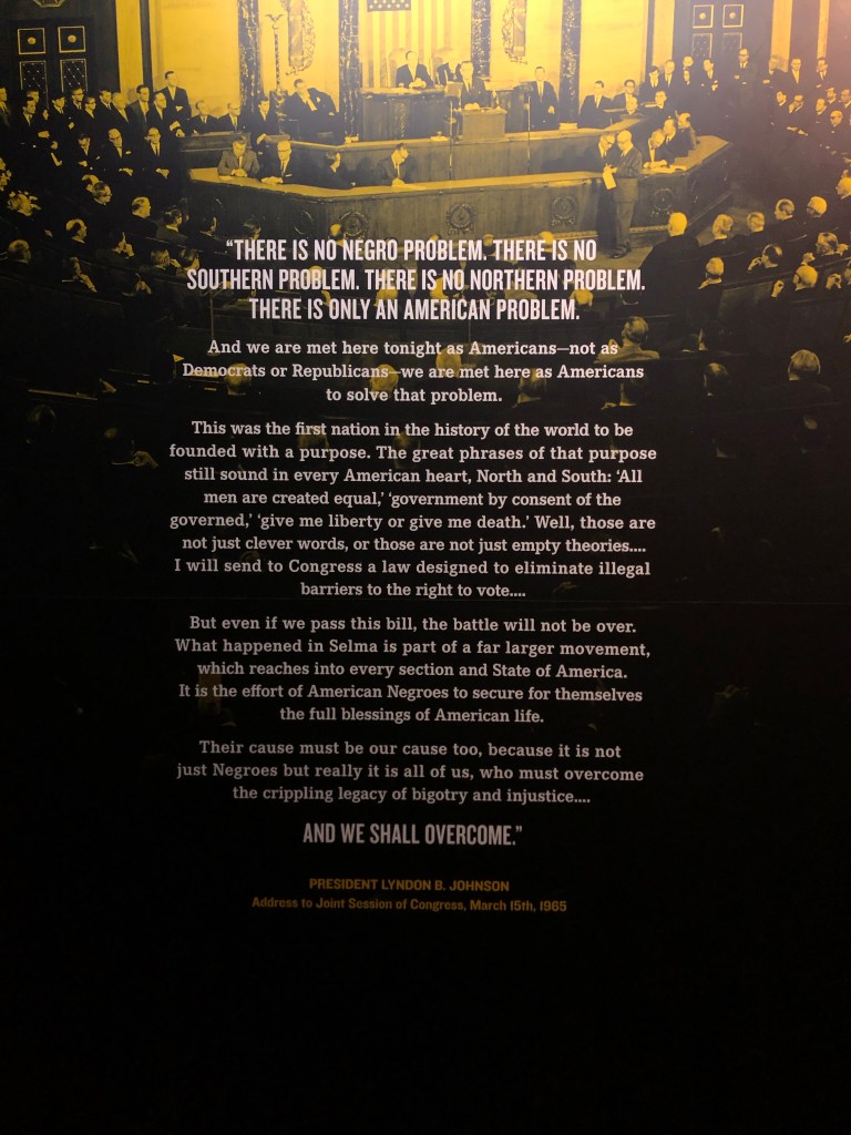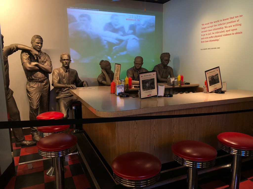 Martin Luther King Jr and Coretta Scott Kingat a meeting of the Southern Christian Leadership Conference (SCLC)Replica of the bus where Rosa Parks refused to give up her seat to a white passenger. Recreation of the lunch counter sit-in in Greensboro, North Carolina. Diane NashStokely Carmichael Julian BondThe Freedom RidersReplica of bombed bus carrying the Freedom RidersMug shots of some of the many non-violent protesters who marched, rode buses, participated in sit-ins during the 50’s and 69’s, and were jailed for it. Description of the prison experience of protesters sent to the Mississippi State Penitentiary This exhibit describes foreign reactions to the racial strife in America, and how it put pressure on the Kennedy Administration to make the country live up to its founding idealsIntegrating education was a major part of the civil rights struggle Music added courage and inspiration to the movement.Remembering the children killed during the bombing of 16th Street Baptist Church in Birmingham, AlabamaRecreation of the March on Washington in 1960 where Martin Luther King Jr delivered his “I have a dream” speechThis exhibit shows the shift in American politics during the civil rights era. Map on the left shows 1960’s electoral college results, and on the right, 1964’s. The standoff at the Elmer Pettus Bridge in Selma, Alabama during the first protest demanding the right to vote on March 7, 1965. The brutal attack on the protesters that followed became known as Bloody Sunday. A second March was held on March 9. Martin Luther King Jr had been called in to lead it. He tried to get a federal ruling to allow the march to proceed peacefully but was unsuccessful at first. He turned the march around at the bridge when the protesters encountered the police waiting for them again.Lyndon Johnson’s speech to Congress introducing the Voting Rights Act on March 15, 1965. The third March from Selma to Montgomery, Alabama began on March 21, 1965 and reached the Alabama State Capitol on March 25. The line of marchers was over a mile long. By this time King had secured a federal order protecting the protesters, who received an escort from the Alabama National Guard. This exhibit shows the dramatic increase in registered black voters after the passage of the Voting Rights ActThe struggle is not over. Significant present goals of Black Americans are featured in this exhibit. The Lorraine Motel section of the museum ends with Martin Luther King Jr’s last days. He was called to Memphis to support a strike by the city’s sanitation workers. The strike had been going on for a long time and no progress was being made in negotiations with the city. Workers were demanding a living wage and humane treatment. “I Am A Man” was their rallying cry. King arrived in Memphis on March 28, 1968 and stayed in this room, #306. On April 3 he gave the last speech of his life, his famous “Mountaintop” speech, to a packed hall at Mason Temple. He was shot on the balcony of this hotel room on April 4. He was 39 years old.