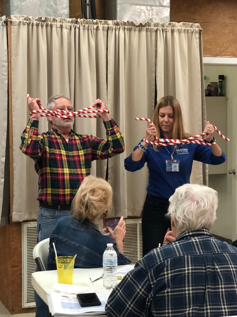 The evening before every travel day on the tour we had a travel meeting. The Wagonmasters and Tailgunners walked us through the next day’s route and provided tips about managing our rigs. Sometimes we had dinner or dessert provided by the staff as part of these meetings. Today Dave Moore, one of our fellow travelers, shared a couple of party tricks. Here he shows Elaine Burt, one of our Tailgunners, how to tie a knot with a fancy two-armed maneuver.