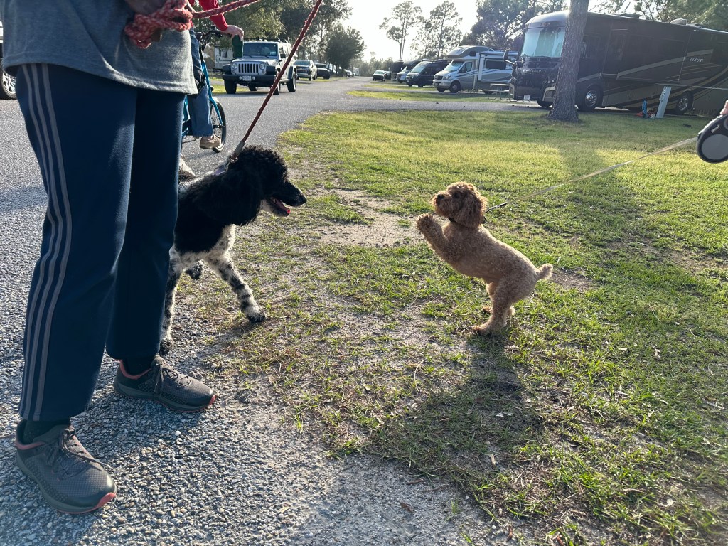 Snowbirding at an RV park offers some unique social opportunities. Many of our neighbors were also “long-termers”, who were there for at least a month’s stay, and some for several months. Some had been coming to the park for several years. The park is large, with almost 500 campsites, and it’s organized into little neighborhoods. We became familiar with the people and pets in our neighborhood before too long. Gracie wasted no time in making a friend who must have reminded her of her buddy Charger back home.