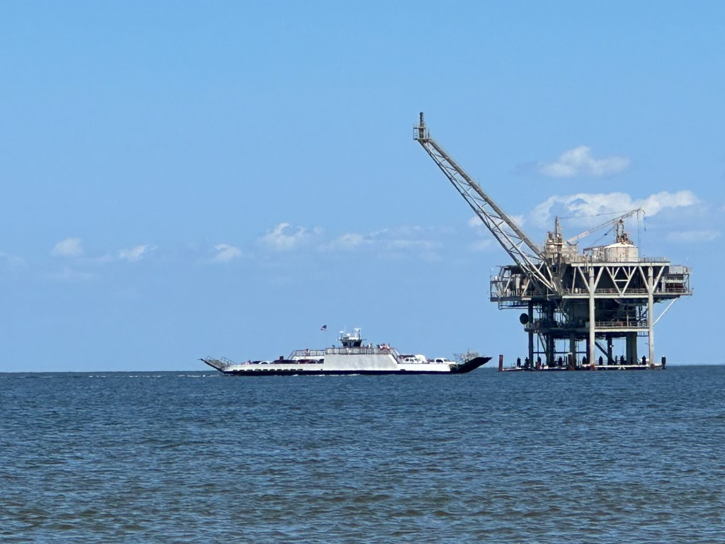 The Dauphin Island Ferry crossing Mobile Bay near an oil drilling rig.