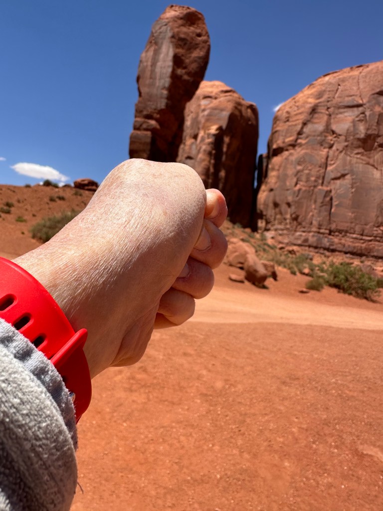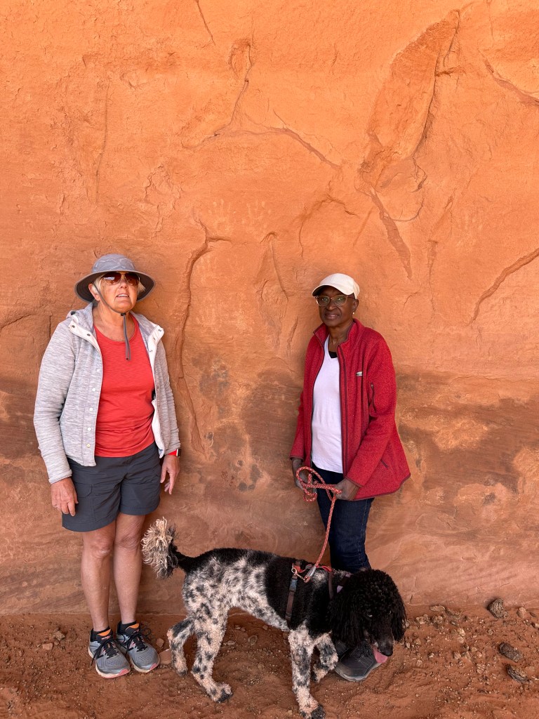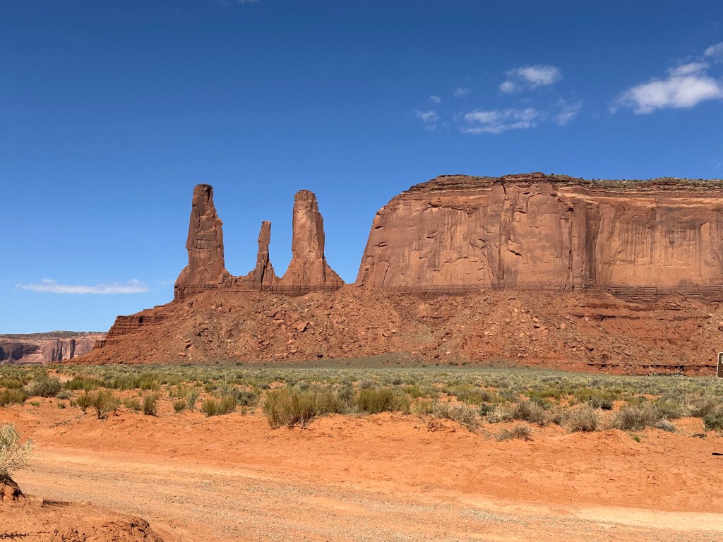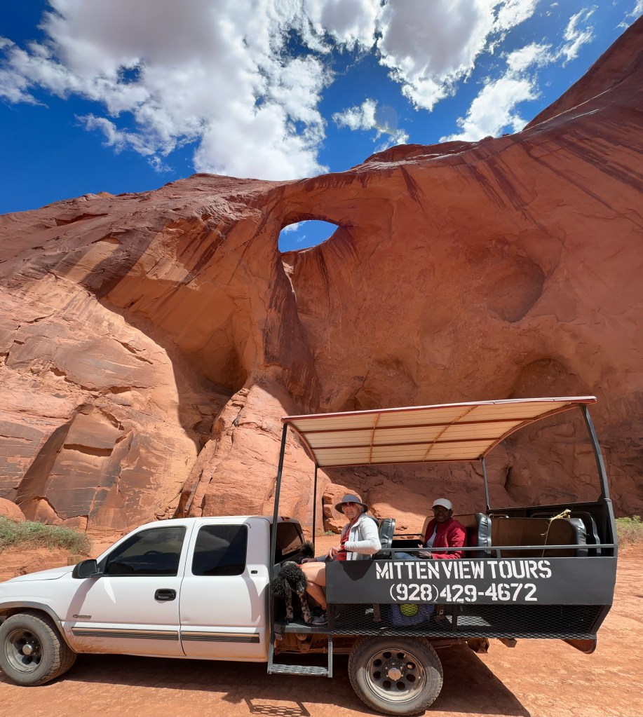We didn’t understand the significance of the “Mitten View” name until we began the tour and spent some time viewing the Mittens formation that has become a symbol of this park. The two mesas have eroded spires that look like (very slender) thumbs on a pair of mittens.