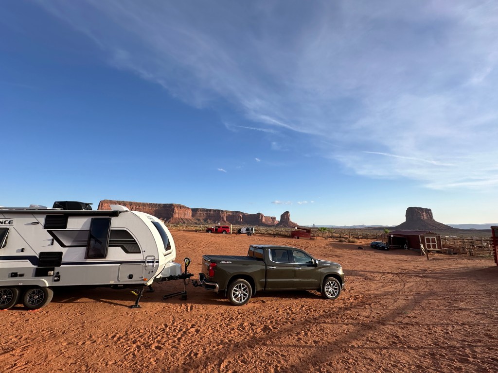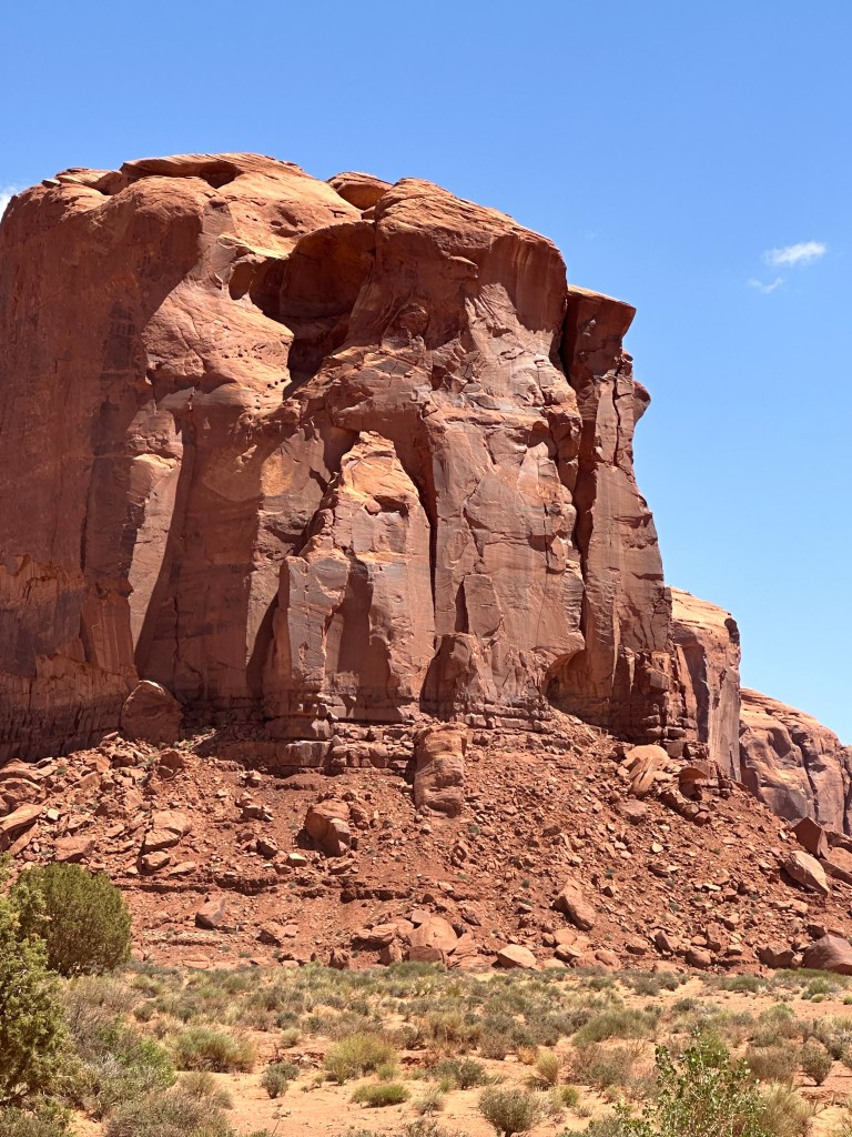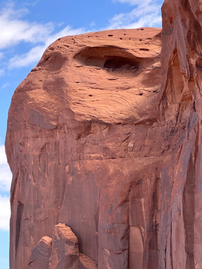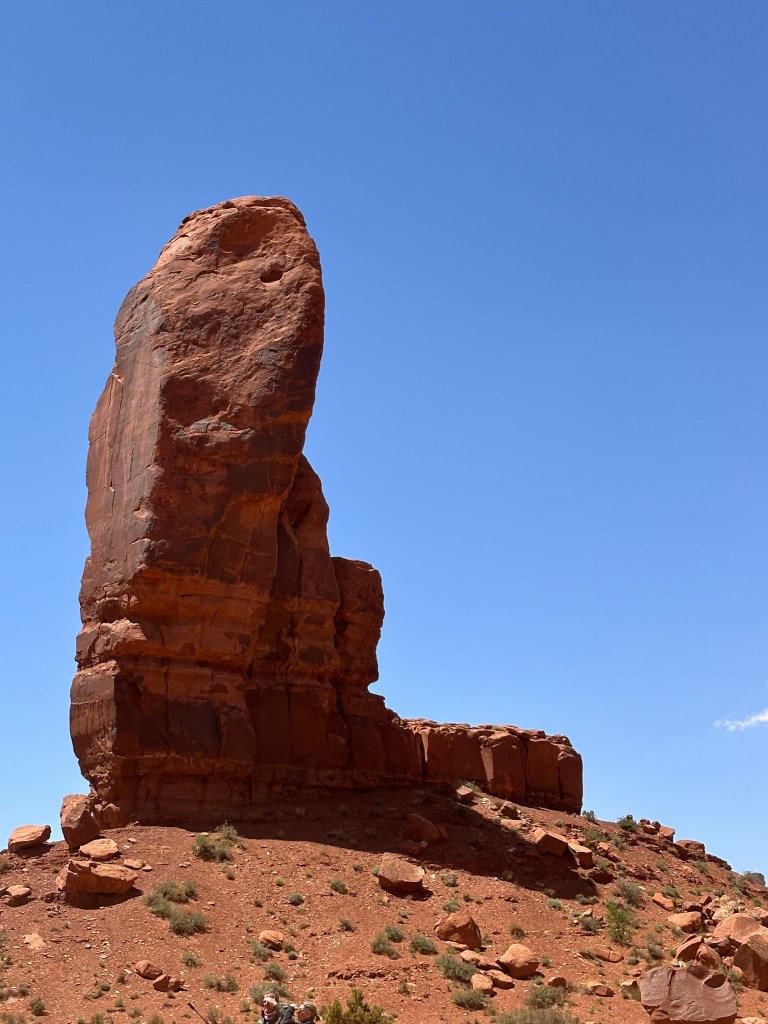 We didn’t understand the significance of the “Mitten View” name until we began the tour and spent some time viewing the Mittens formation that has become a symbol of this park. The two mesas have eroded spires that look like (very slender) thumbs on a pair of mittens.