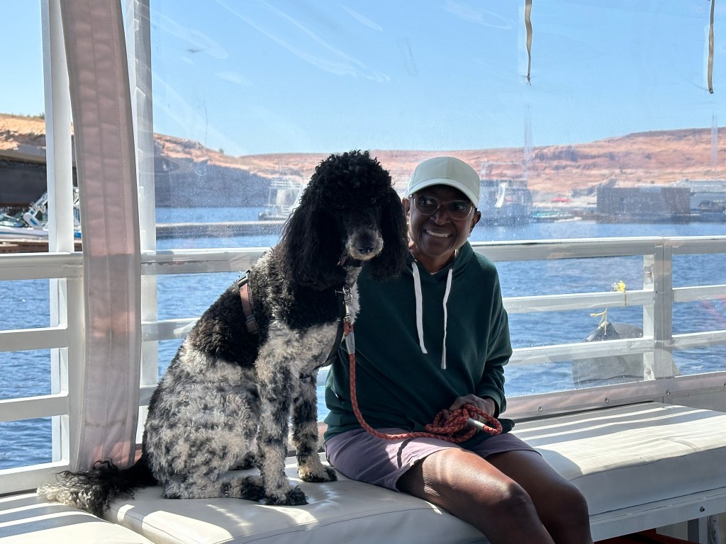 The marina includes a sizable restaurant and gift shop, all floating on the surface of the lake. There are also boat tours of Antelope Creek and other locations leaving frequently. We took a tour of Antelope Creek, and the nice ladies running the tour allowed Gracie to join us. She was in her element!