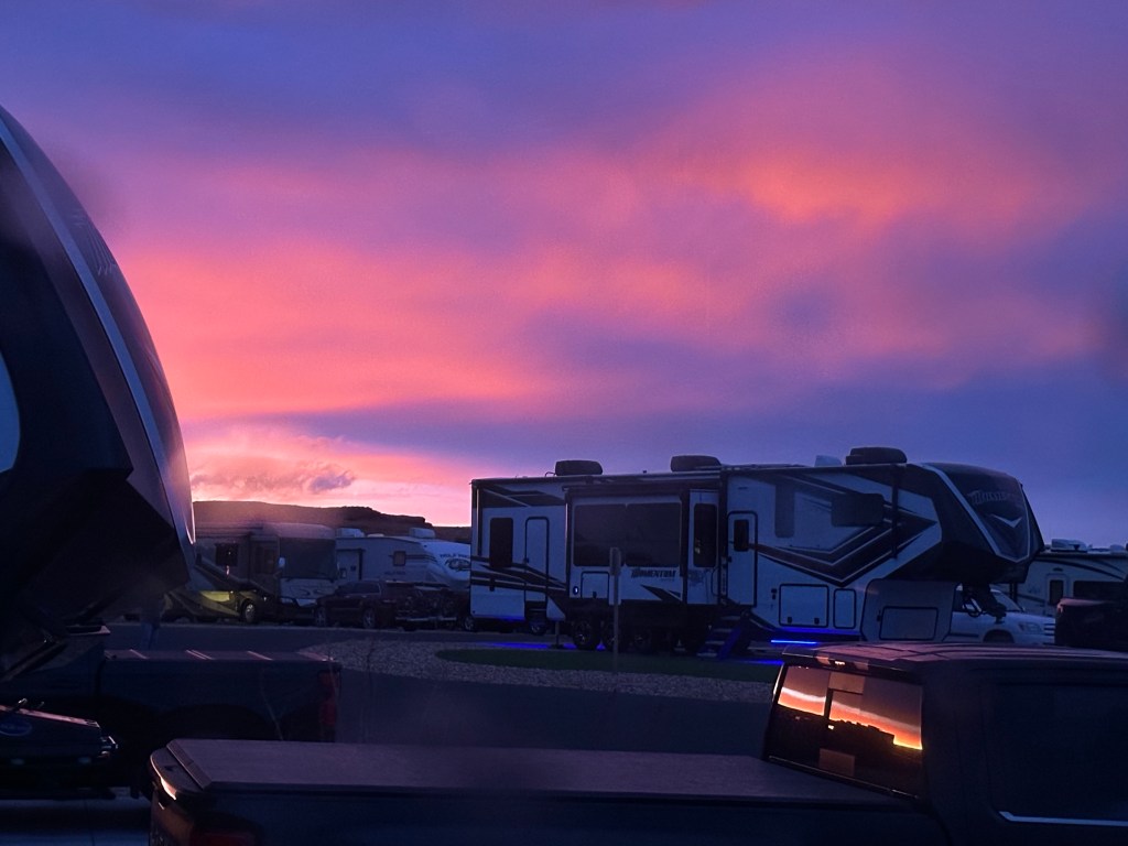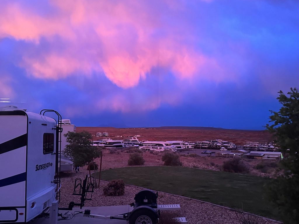 I mentioned at the beginning of this post that we had planned to stay at Antelope Point for 2 days. Our departure date was to be May 6. However, while we were there, an intense storm was brewing across much of the country. While we were not in the area where the worst weather was predicted, the wind at the RV park was intense. The forecast called for high winds for the next 2 days. We elected not to travel until the winds had died down enough to make it safe on the road. (We later learned that the storm spawned an EF4 tornado that struck Barnsdall and Bartlesville, Oklahoma, where we had visited three weeks earlier. We were relieved to learn that Woolaroc’s buildings and livestock were not harmed, although some tree damage did occur. The towns of Barnsdall and Bartlesville were damaged, and one person was killed in Barnsdall.).