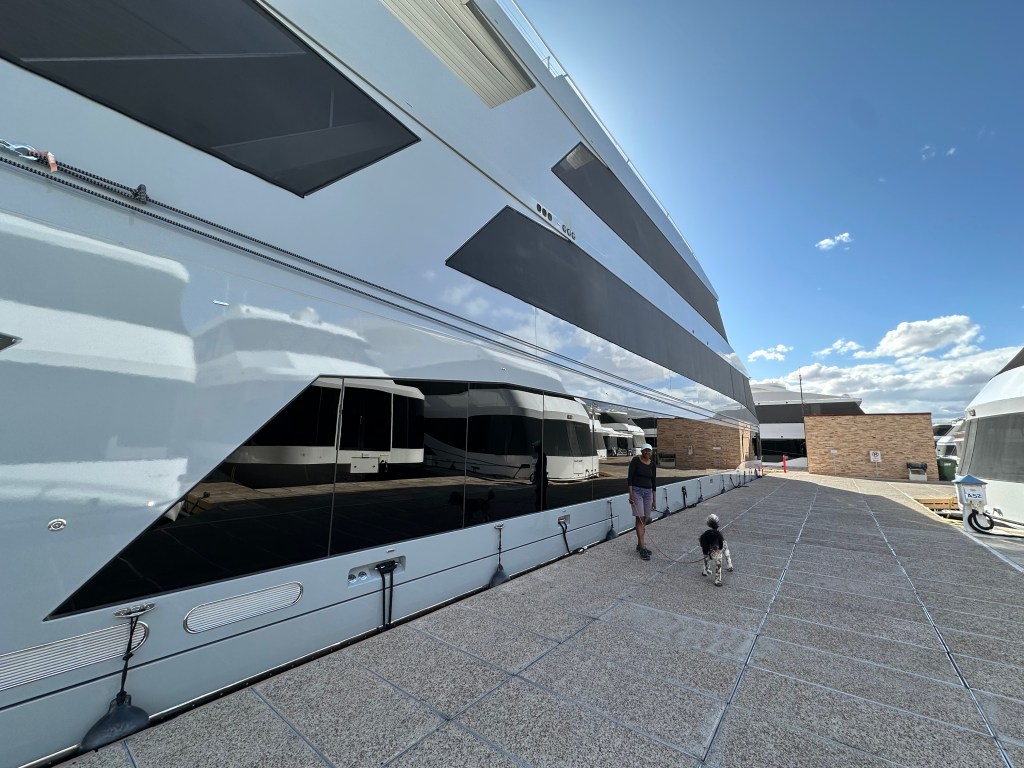 Down the hill from the RV park is a marina where houseboats used on the Lake are docked. Des and I visited Lake Powell 25 or so years ago. We were not prepared for the boats we found tied up at the marina!